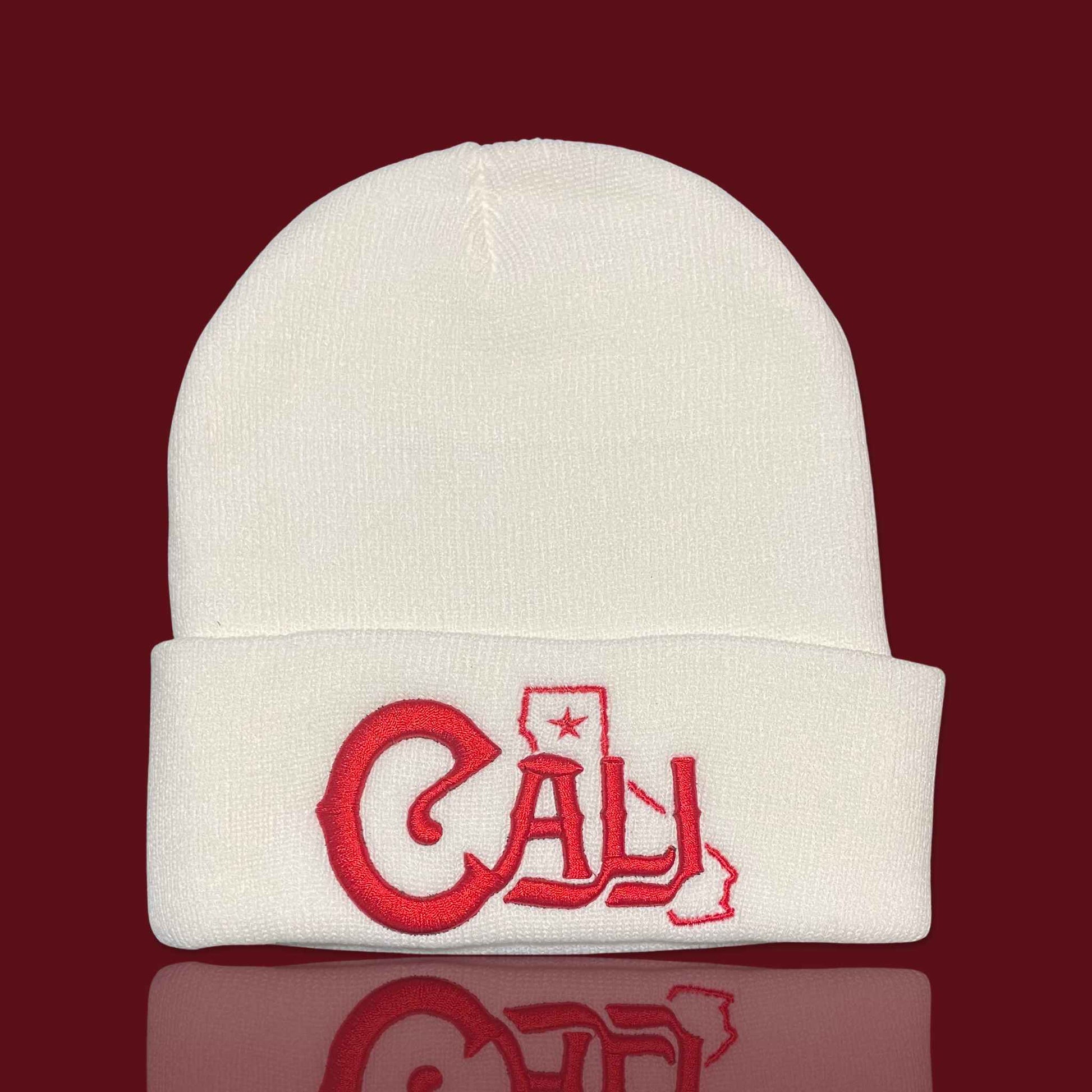 "CALI Star" White, Red Lettering Embroidered, Beanie Cap