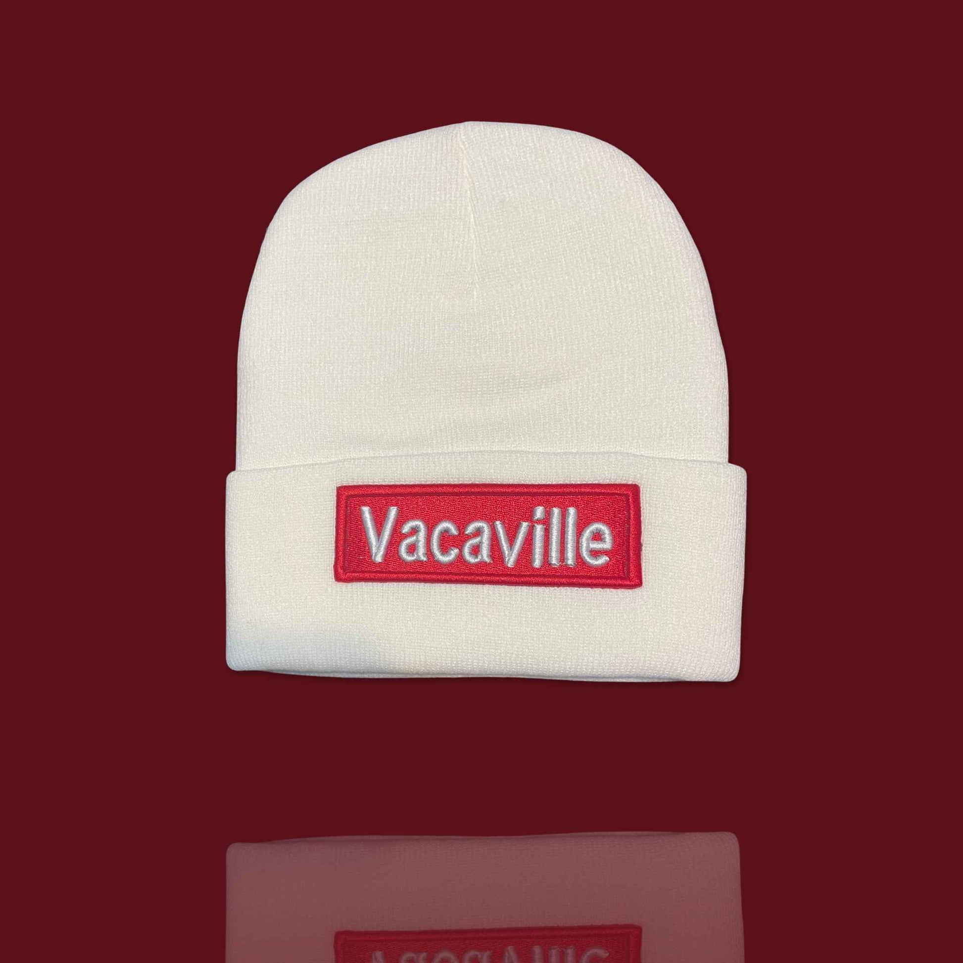 "Vacaville" White, Red Lettering Embroidered, Beanie Cap